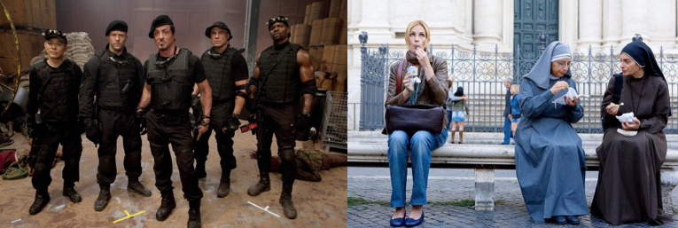 It was almost too much to wrap my soggy head around. “The Expendables” vs. “Eat Pray Love”. What’s a guy to do?