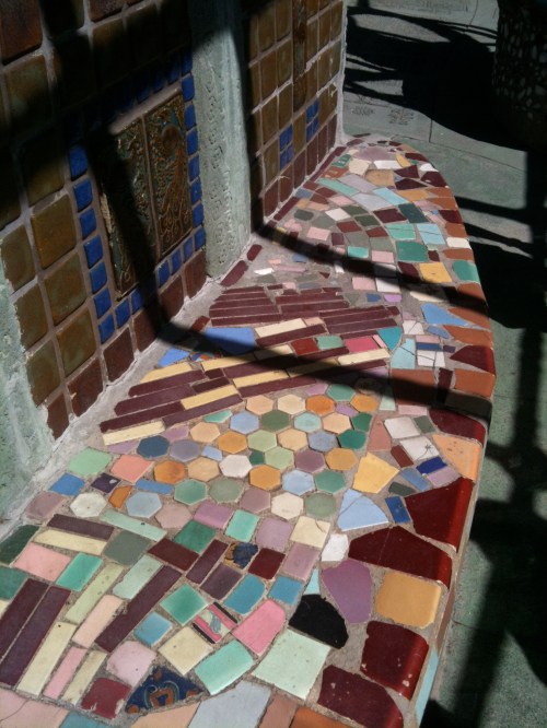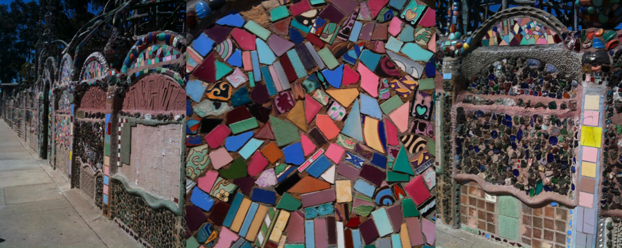 The outer wall running along 107th Street is fantastically adorned with tiles, seashells, broken pottery, glass bottles and handcrafted designs – which obviously helped to inspire Isaiah Zagar’s work in Philly.