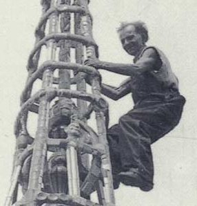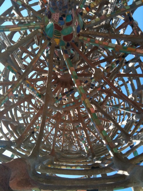 Rodia bought his lot on 107th Street in 1921, and for 34 years, he crafted his elaborate towers all by himself. Rodia didn’t use machines or scaffolding or bolts or welds. He used simple hand tools. Rodia didn’t even work out his complex designs on paper. His wondrous creations of concrete, steel, glass and ceramic odds and ends sprang day-by-day, year-by-year, out of his head.