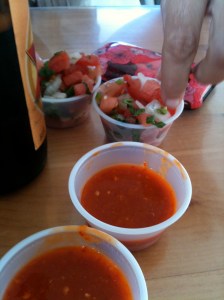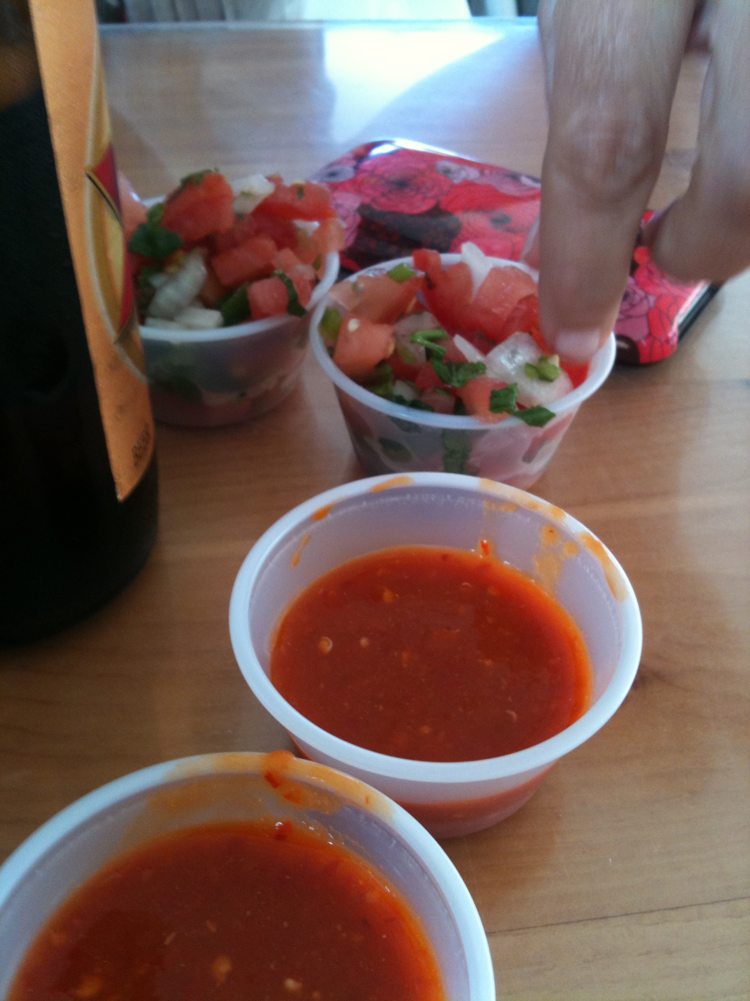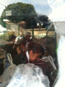 Surveying the seating situation, it was clear that some selfish scoundrels had snuck in the back door and taken seats while the rest of their party was still in line waiting to order. (That’s not cool at La Super-Rica.) Victoria let the malefactors know that their sin was obvious to all, and those of the guilty who were capable of shame slunk away and made room for those – like us — who had already ordered.