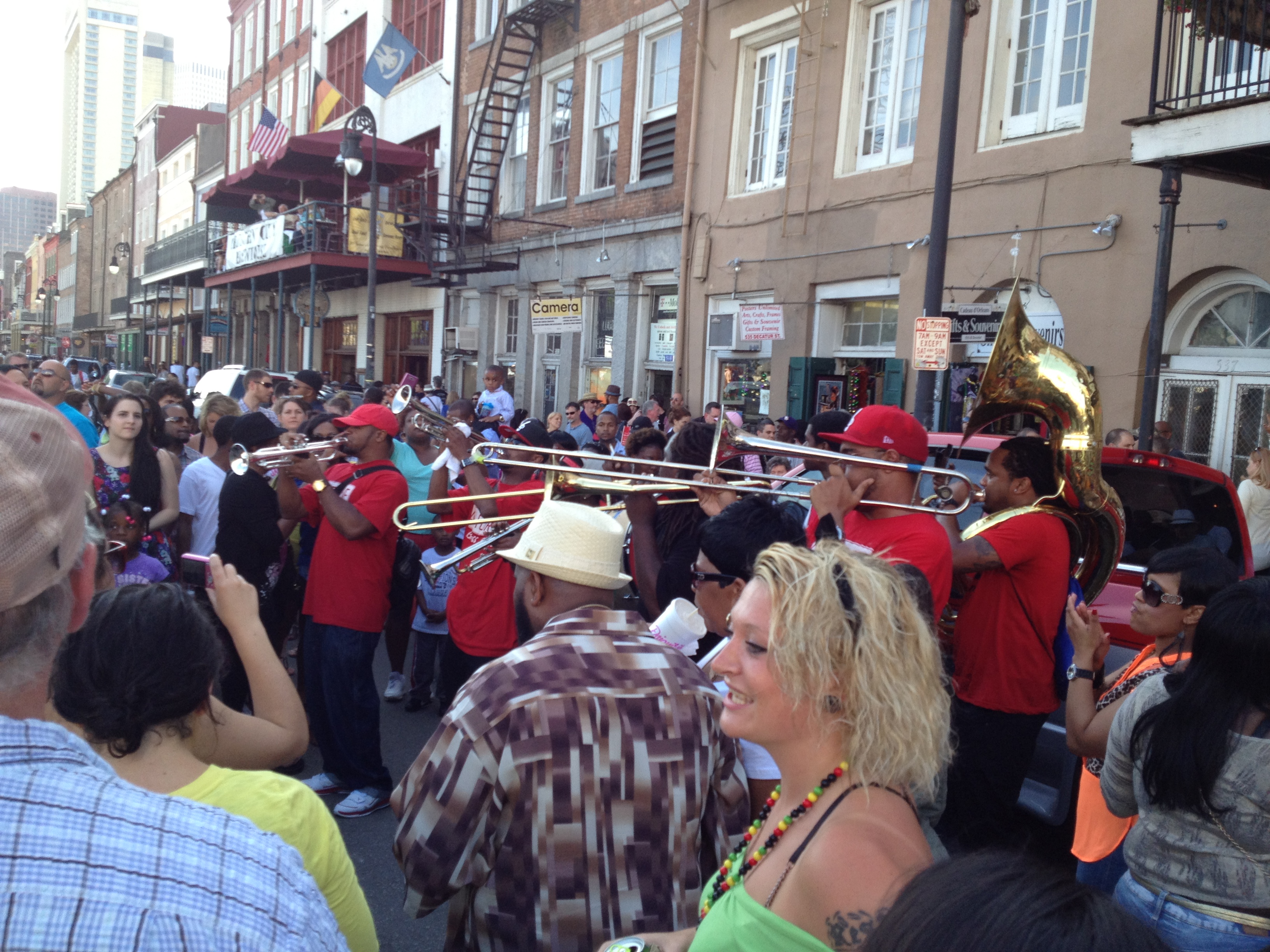 After our visit to Tulane we hopped that street car and returned to the French Quarter. The streets weren’t as crowded as they’d been the day before for the French Quarter Festival — but the the mood was still celebratory and the music was still playing.