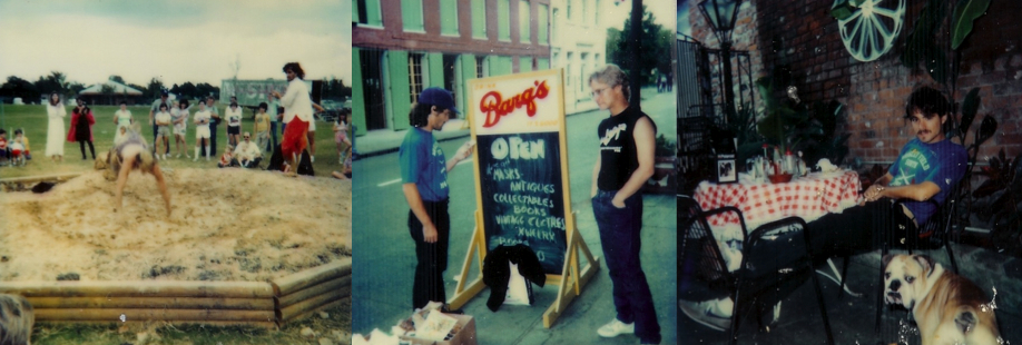 (Left) Doing the Sturdy Beggars Mud Show. (Center) The author and Ross Salinger in the French Quarter. (Right) John Goodrich relaxes in the courtyard of Napoleon House. (1984)