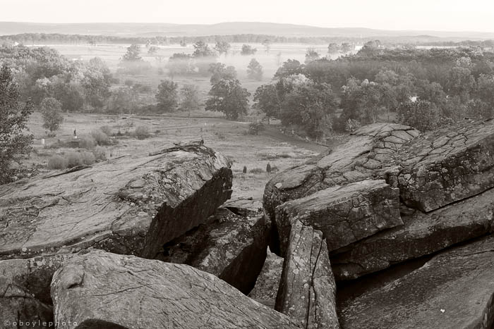 Before the fights in The Peach Orchard and Wheat Field, Union General Gouvernor Warren stood on Little Round Top and saw Longstreet’s battle line forming on the ridges beyond The Wheat Field.