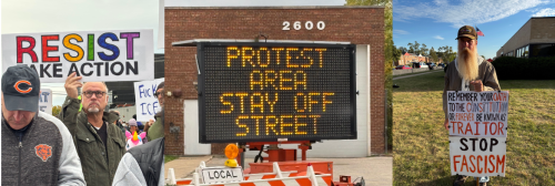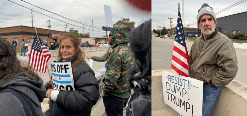 The folks in the middle were the County sheriffs and the Broadview cops. They were there to maintain order – especially the Broadview mayor’s 6:00 pm protest curfew. We tried to remind them that our First Amendment rights to assemble and engage in free speech do not have an expiration date – or hour. We asked them why they don’t wear masks, but the ICE goons do. We asked them if they knew what was going on in the detention center. We asked them, as professional policemen, if they were comfortable protecting guys who were arresting people without a warrant and affording them no due process.