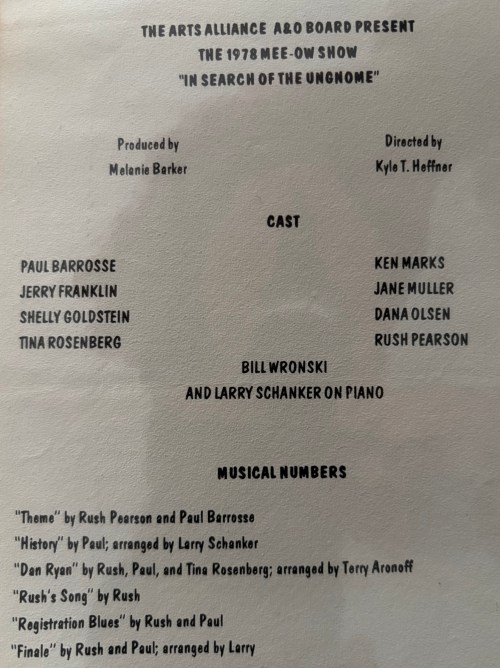 I loved everything about the Mee-Ow Show process: the music, the comedy, the late nights scripting sketches at Rush or Dana’s apartments after rehearsals. And when we performed the shows and the packed crowds laughed every night, I was hooked. I was home.