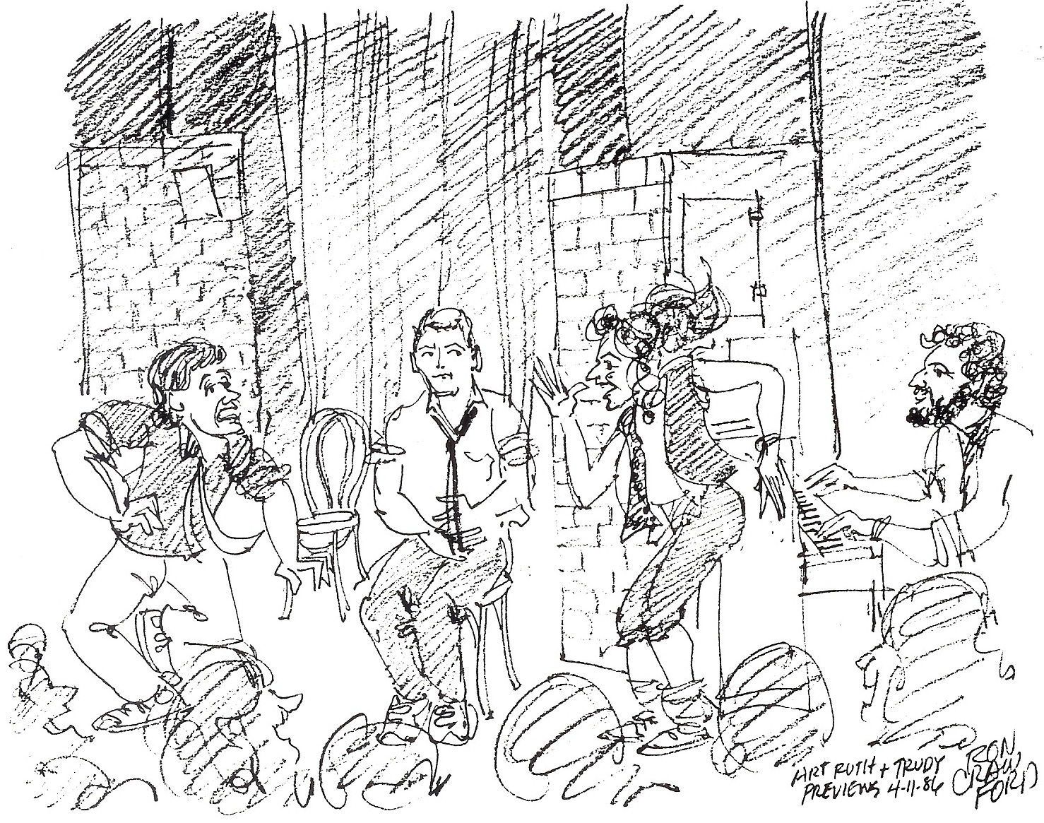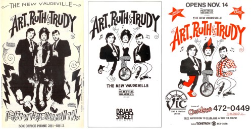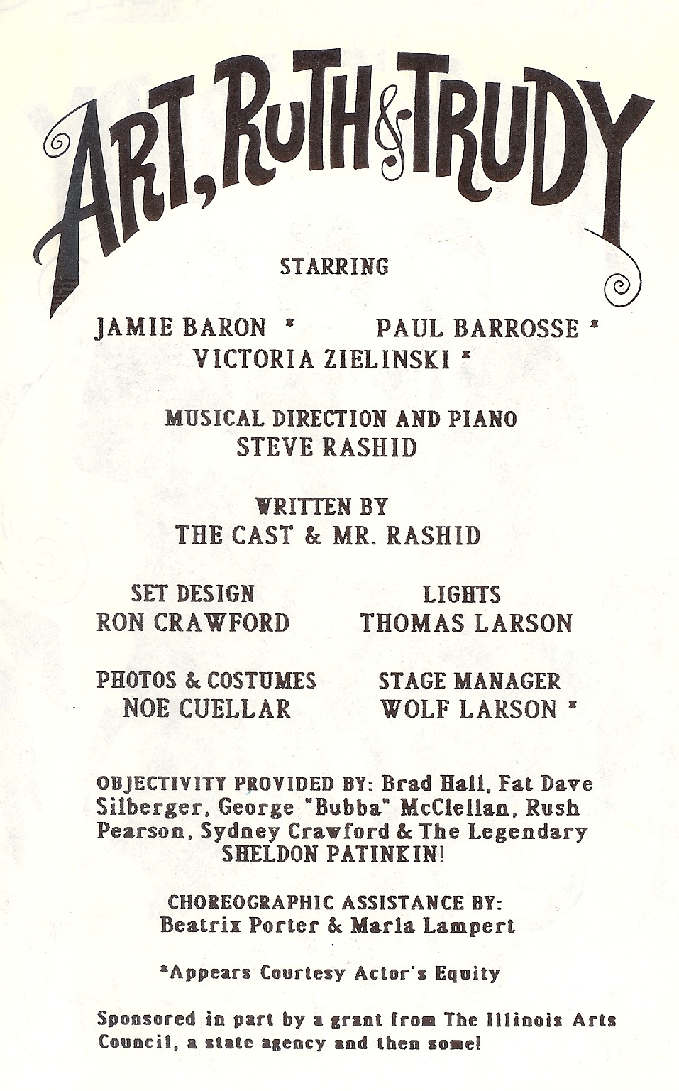 Art, Ruth & Trudy opened in early May 1986 at Club Victoria, a tiny drag bar and showroom at 3153 N. Broadway near Belmont Avenue in Chicago. Ron Crawford created our vaudeville backdrop, stage manager Tom Larson designed the lights, our comedy guru, Sheldon Patinkin, gave us his usual brilliant direction and Artistic Director in Exile Brad Hall came to town to help stage the show.