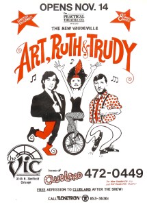 At the time, another friend and NU alum, Steve Jarvis, was operating a trendsetting nightclub at the Vic Theatre called Clubland, which featured an emcee, a team of dancers, and lots of video monitors showing music videos: very cutting edge stuff in ‘86. I’d been working for Steve as an entertainment director, writing comedy material for the live performers and video monitors – so when the still-popular Art, Ruth & Trudy had to make way for a new show at Briar Street (Hamburger Twins), Steve and Vic Theatre owner Tom Klein booked us into their venerable vaudeville house, which opened in 1912. With the help of Clubland’s technical staff, including video and lighting wizards, Tom Piazza and Terry Shaughnessy, Art, Ruth & Trudy ran another two months in the 1,000 seat theatre, playing to the largest audiences in PTC history.