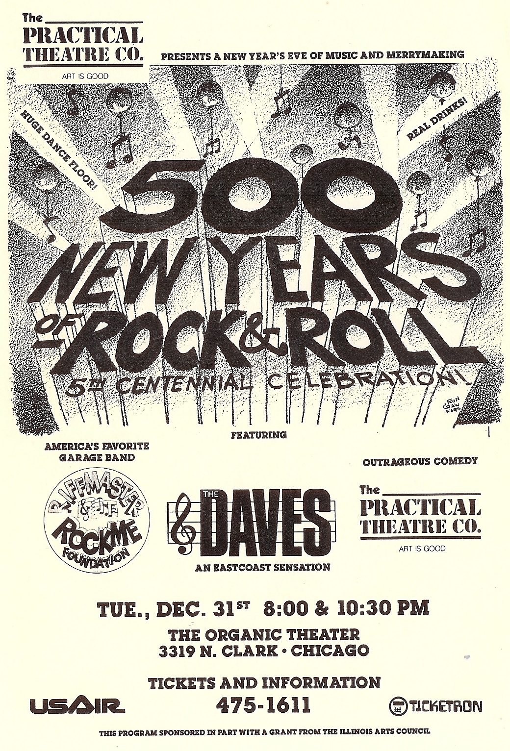As Riffmaster & The Rockme Foundation and The Daves (featuring Jerry Getz, Bekka Eaton, Jim Ericson and Rockin’ Ronny Crawford doing double duty) rocked the Organic Theatre space that New Year’s Eve and rang in 1986, the Practical Theatre expatriate community danced joyfully into the wee hours. The event was a benefit and, as usual, we did a far better job of raising the roof than we did raising money. For the PTC, the year ahead was a question mark.