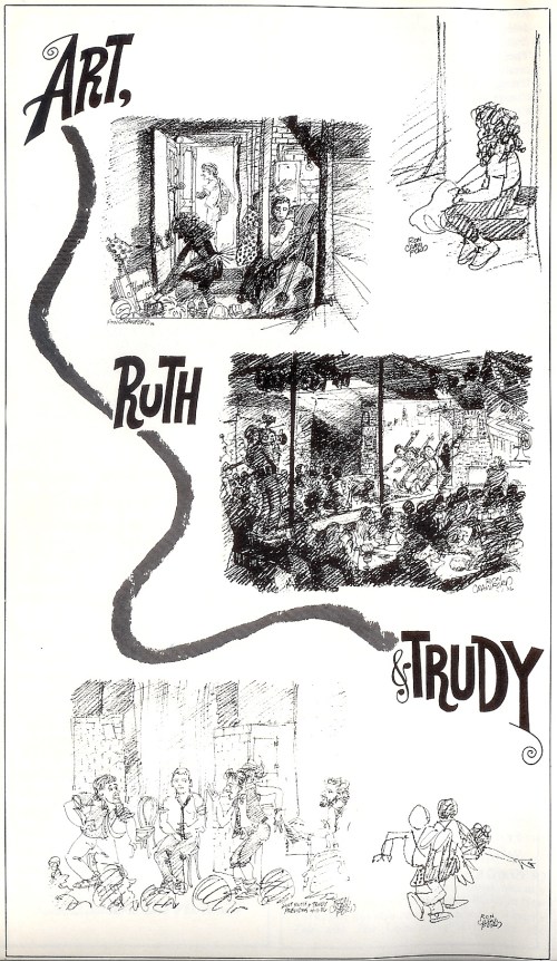 I wish to take a pause from sobbing over lost youth to go on record as having first submitted the title of “Art, Ruth and Trudy” as far back as Mee-Ow. I resubmitted it for every show I was in, and then moved to New York, whereby I ceded all rights to the title. Yes, I am that insecure, that I need to glom on the glory train, if only over a detail.
