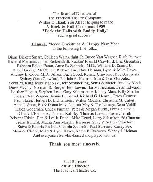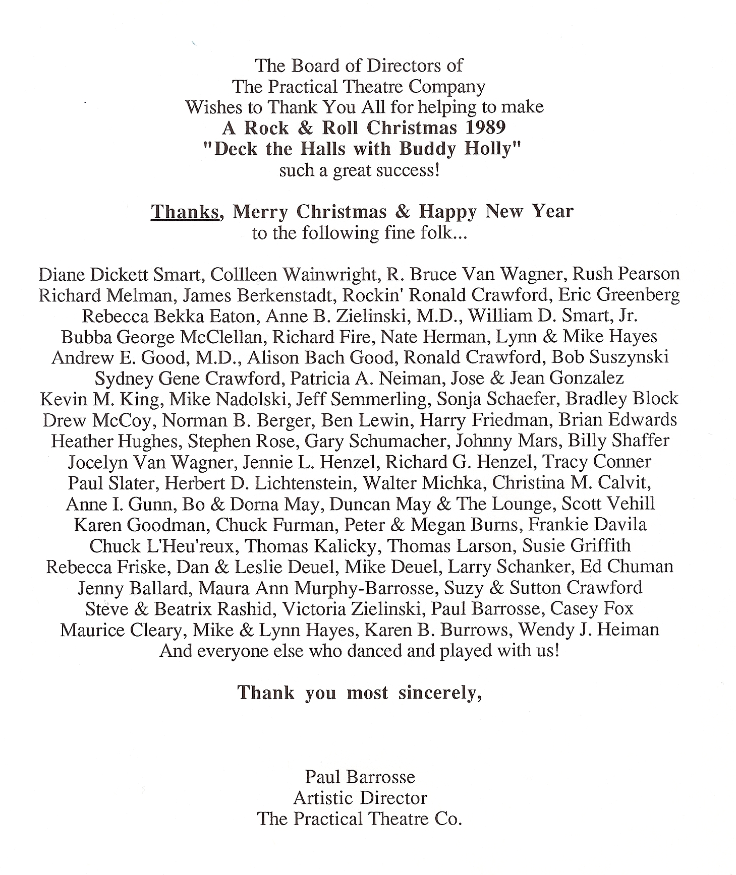 The last Practical Theatre event in the 80’s was our Rockme Christmas 1989 party entitled “Deck the Halls with Buddy Holly.”
