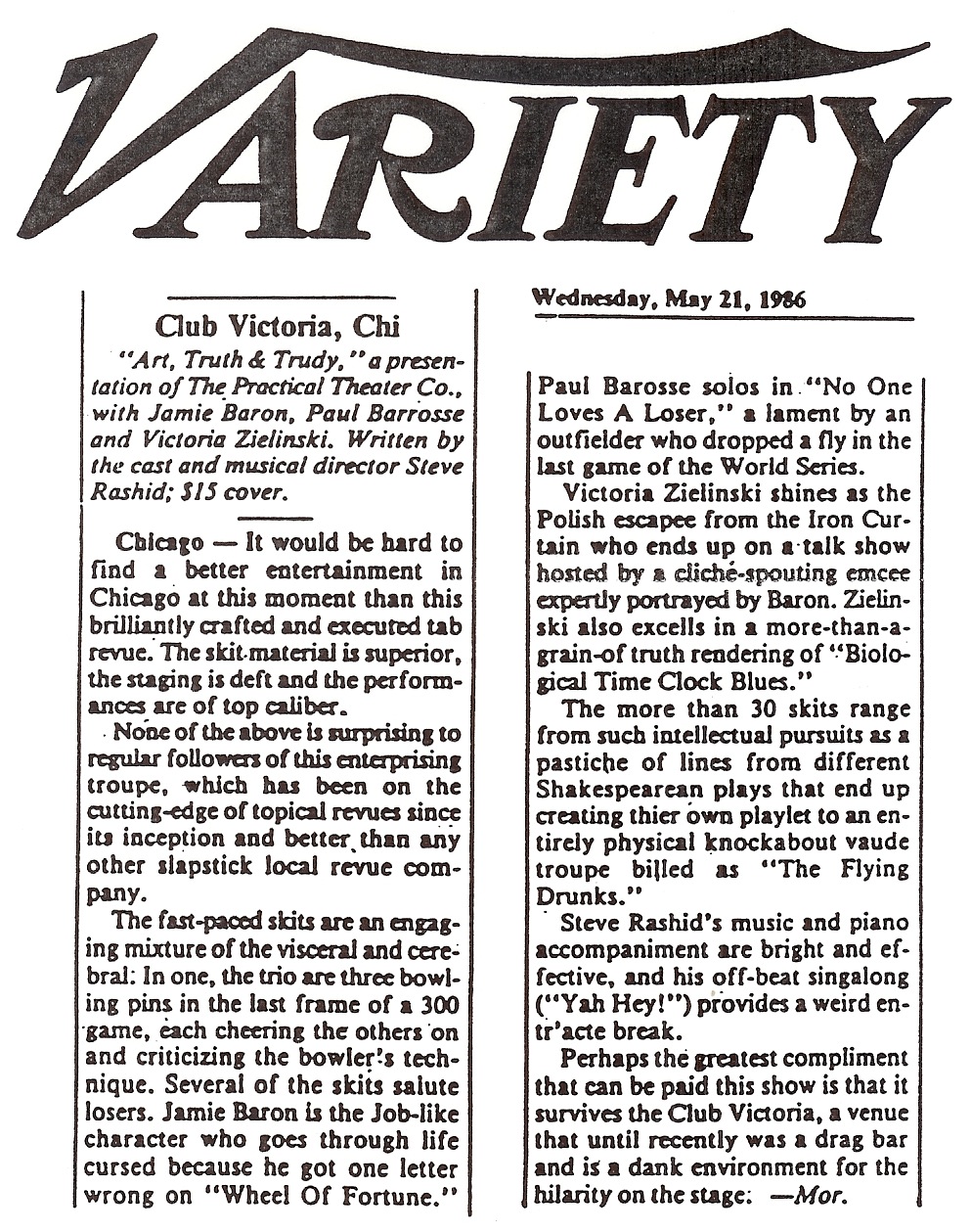 That summer, while we were still at Club Victoria, Saturday Night Live called on the PTC again – and Victoria was flown to Hollywood for a screen test. In an egregious lapse of casting judgment, NBC gave Vic’s spot to another Victoria, an screwball blonde with the last name Jackson (who has since gone on to become a right wing crank and Tea Party member). About that same time, on July 18, 1986, The Chicago Tribune’s Rick Kogan updated the public on the progress of The PTC and Art, Ruth & Trudy: