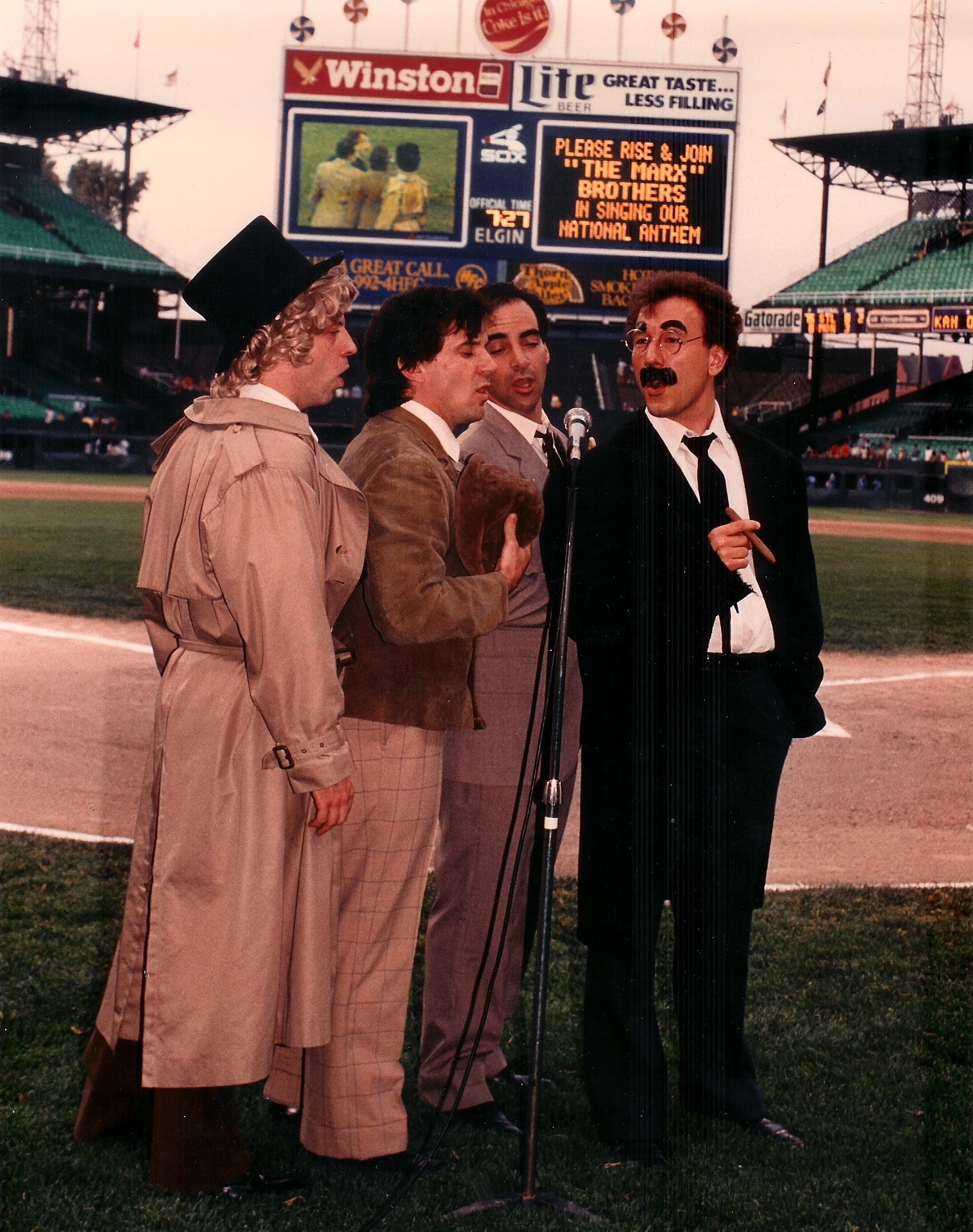 The highlight of my Minnie’s Boys gig was appearing as The Marx Brothers singing the National Anthem in four-part barbershop harmony at Comiskey Park. I still have the baseball that Kansas City Royals Hall of Famer George Brett threw me moments before we started singing. “Hey, Chico!” he called out. My heart raced so much after I made a barehanded shoe-top grab of Brett’s toss that I wavered on my first note. And I was the guy singing the first note! I caught Brett’s pitch but I nearly threw our quartet off-pitch.