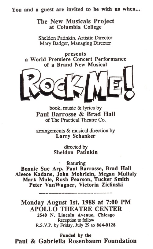 Brad and I pitched Sheldon on a show about an aging garage band – and the New Musicals Project chose Rockme! as one of the three projects to workshop in 1988.