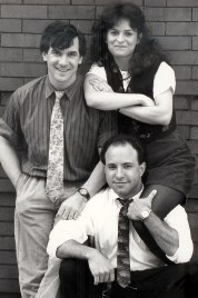In the 1980’s, it was not strange to see Victoria and me onstage making people laugh in various improvisational comedy revues at Practical Theatre. I was finally able to cast Victoria in our smash hit Megafun at Piper’s Alley in 1983, and we were both in the PTC’s longest-running revue, Art, Ruth & Trudy (1986) with fellow Northwestern alum, Jamie Baron and musical director, Steve Rashid. Art, Ruth & Trudy ran in Chicago for a year – from Club Victoria, to The Briar Street Theatre, to the Vic Theater. That was the first time Vic and I were in a comedy revue together. She was so sexy and funny and smart — I asked her to marry me. But I would have to wait a while longer.