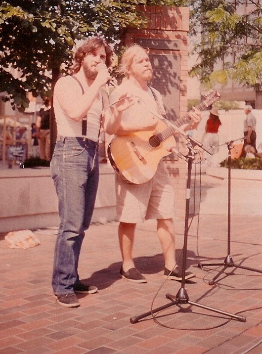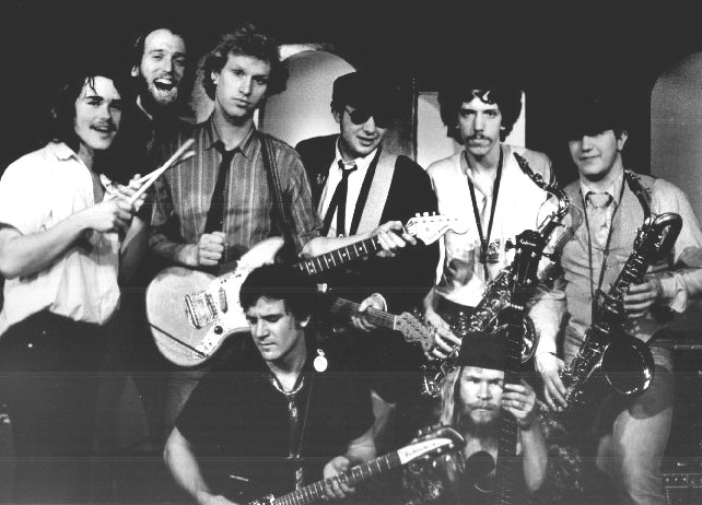 I can’t remember how soon Pete was dubbed “The Riffmaster”, but from the moment he showed us his fabulous fretwork, we knew we’d found ourselves a lead guitarist – and the band soon took form. By the time the sun finally came out that summer, Pete, Rush, Brad, and I were playing 50’s and 60’s covers (and original songs with a classic feel) at the Body Politic Street Festival and assorted gigs and parties. Our drummer at time was Pete’s younger brother, Ellis, and we also featured the Tom-Tom Horns: Tom “Wolf” Larson (the PTC’s technical director) on tenor sax and Tom “Beefma” Kalicky (my high school band mate who still had the PA system) on baritone sax. Were the horns with us on those first gigs? I’m pretty sure Wolf was. But Beefma and his venerable and durable Shure PA system were not far behind.