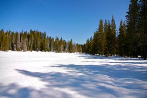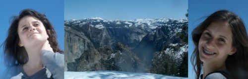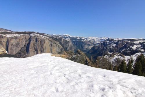 It was my first time wearing snowshoes, and while these weren’t the classic snowshoes I’d known from watching Yukon Mountie movies as a kid, we all put on our red plastic versions and stepped out across the frozen snowpack through stands of lodgepole pines and blindingly white wide open meadows on our way to Dewey Point on the south rim of Yosemite Valley.