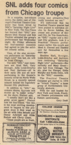 A month later, in late August, I can remember painting the set for our Howard Street production of Bertolt Brecht’s In the Jungle of Cities in between interviews with The Associated Press and The Illinois Entertainer about our SNL hiring.