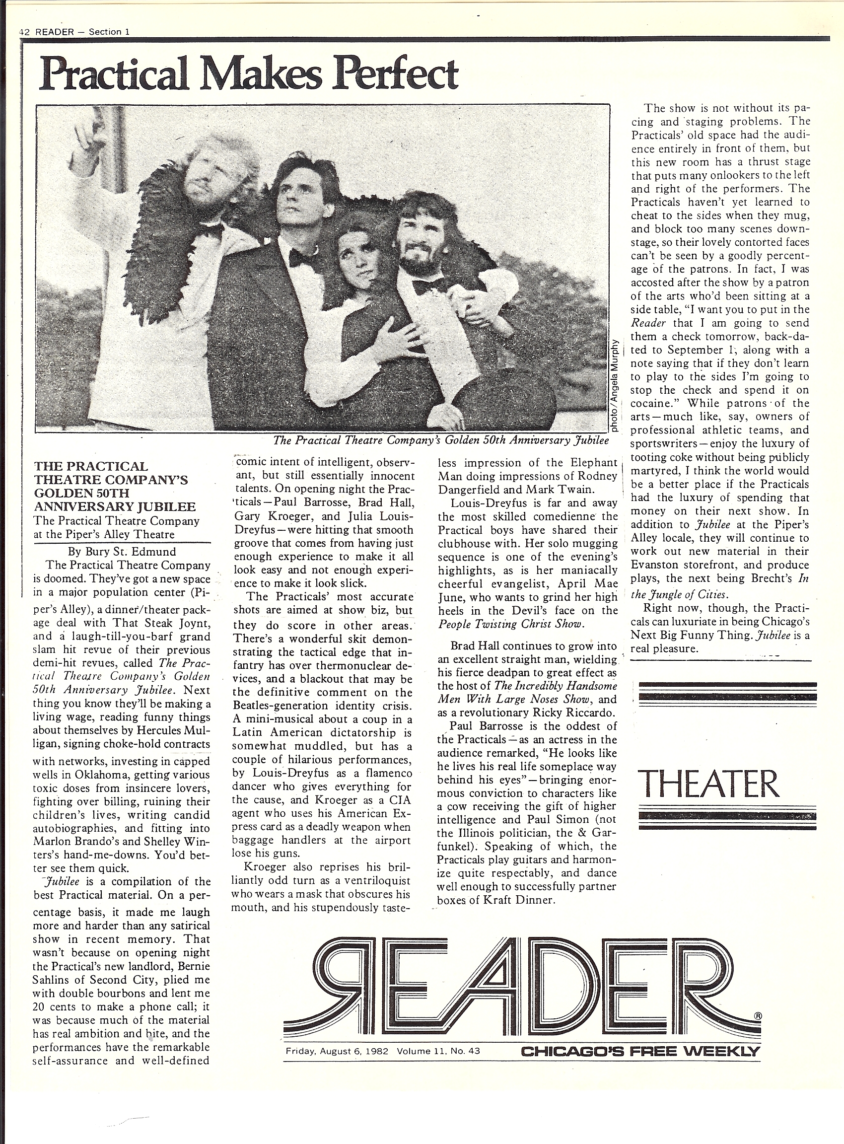 On July 28, 1982, The Practical Theatre Company opened The Golden 50th Anniversary Jubilee at the brand new Piper’s Alley Theatre behind Second City. A collection of the our greatest hits and some new material, The Golden Jubilee was directed by Sheldon Patinkin, and earned rave reviews. The Chicago Reader proclaimed, “Practical Makes Perfect.”