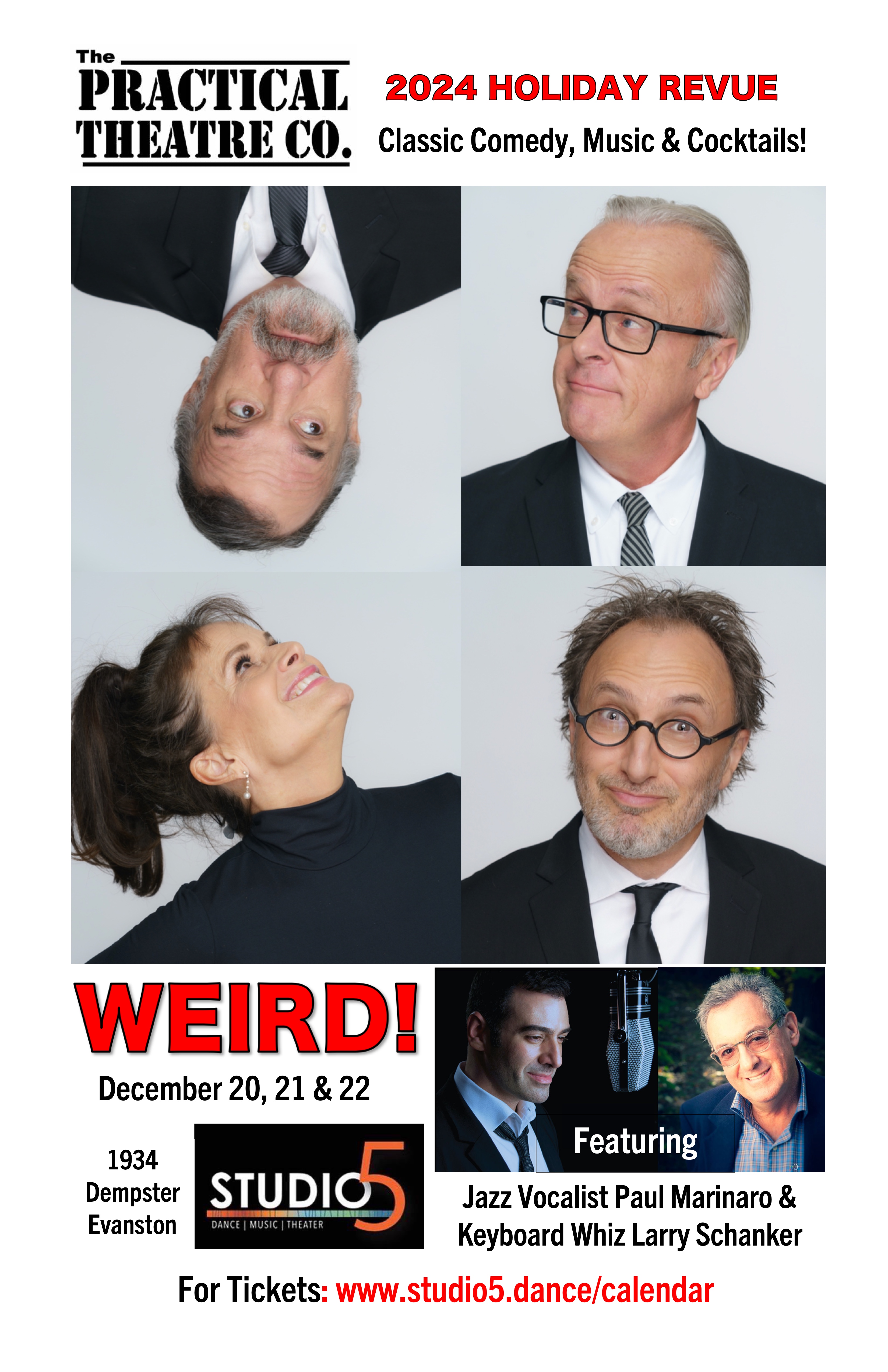 Studio5 is Evanston’s shining gem of a cabaret theatre performance space — with adult drinks available at the bar — and acres of free parking. Laughs, music & adult beverages! Holiday fun in classic Practical Theatre style. Featuring Paul Barrosse, Victoria Zielinski and Dana Olsen. With Steve Rashid & the Studio5 All-Stars, keyboard whiz Larry Schanker, Chicago’s finest jazz vocalist Paul Marinaro, Jim Cox on bass, and Robert Rashid on drums. Let’s all enjoy a laugh at the close of 2025. We could all use a good laugh, right?