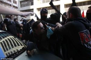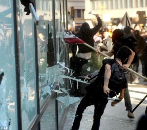 A group of about 300 men, many wearing black, some carrying wooden sticks, was part of a group of hundreds who set out to cause a general strike in the area around City Hall. The smaller group smashed several windows of the Wells Fargo branch while chanting, “Banks got bailed out; we got sold out.” They also spray-painted an expletive on the outer wall of the bank. Employees were inside while this took place, but it did not appear that anyone got hurt.