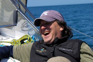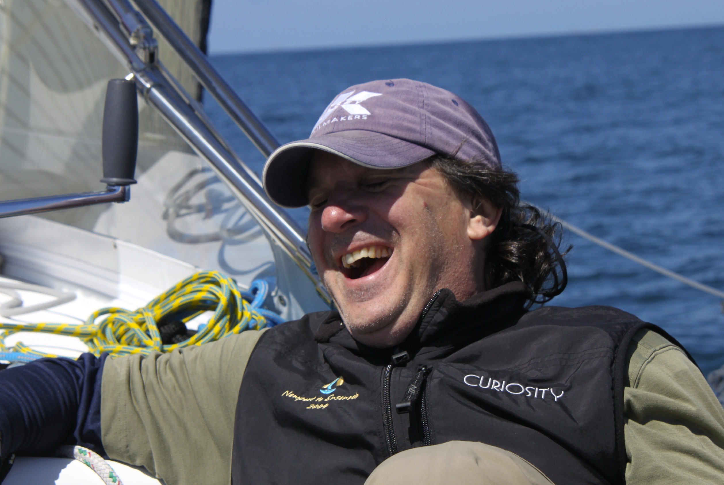 Captain George relaxes against the lifelines as the sun starts to set. We were making a steady 6-8 knots in light wind – and our hearts were full of hope. Misfit was proving to be very nimble boat.