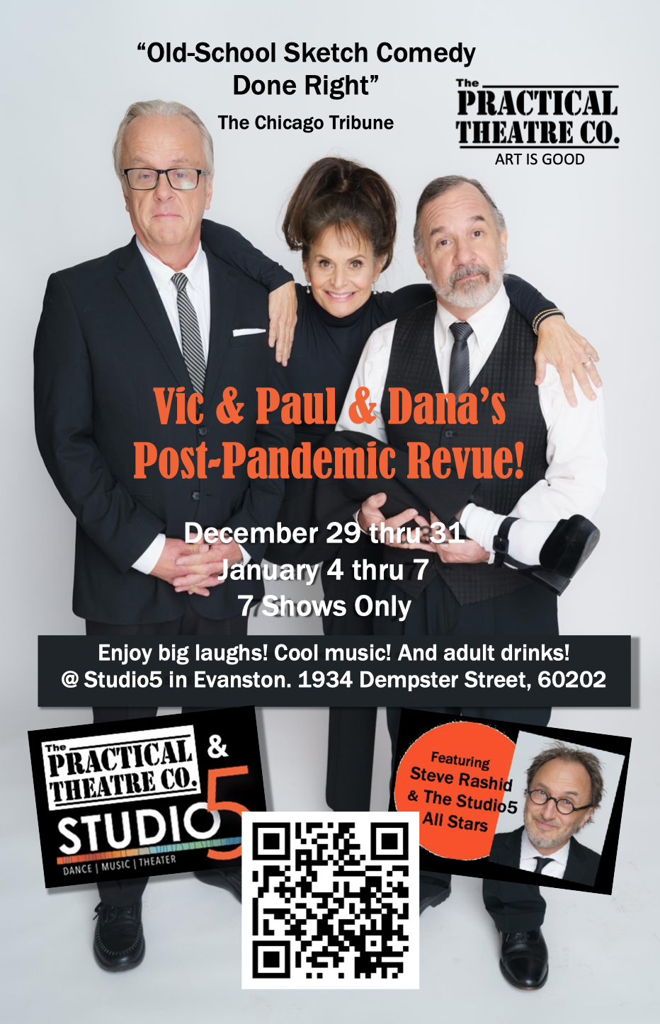 Nearly four decades after leaving our beloved storefront theatre on Howard Street (The John Lennon Auditorium) in 1985, The Practical Theatre Company is re-establishing an ongoing presence in Evanston with a residency at Studio5 — where we recently sold out the limited run of our comedy hit, Vic & Paul & Dana’s Post Pandemic Revue.