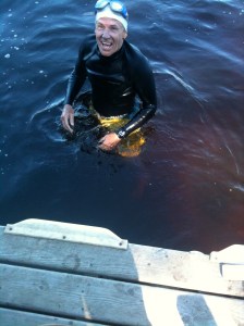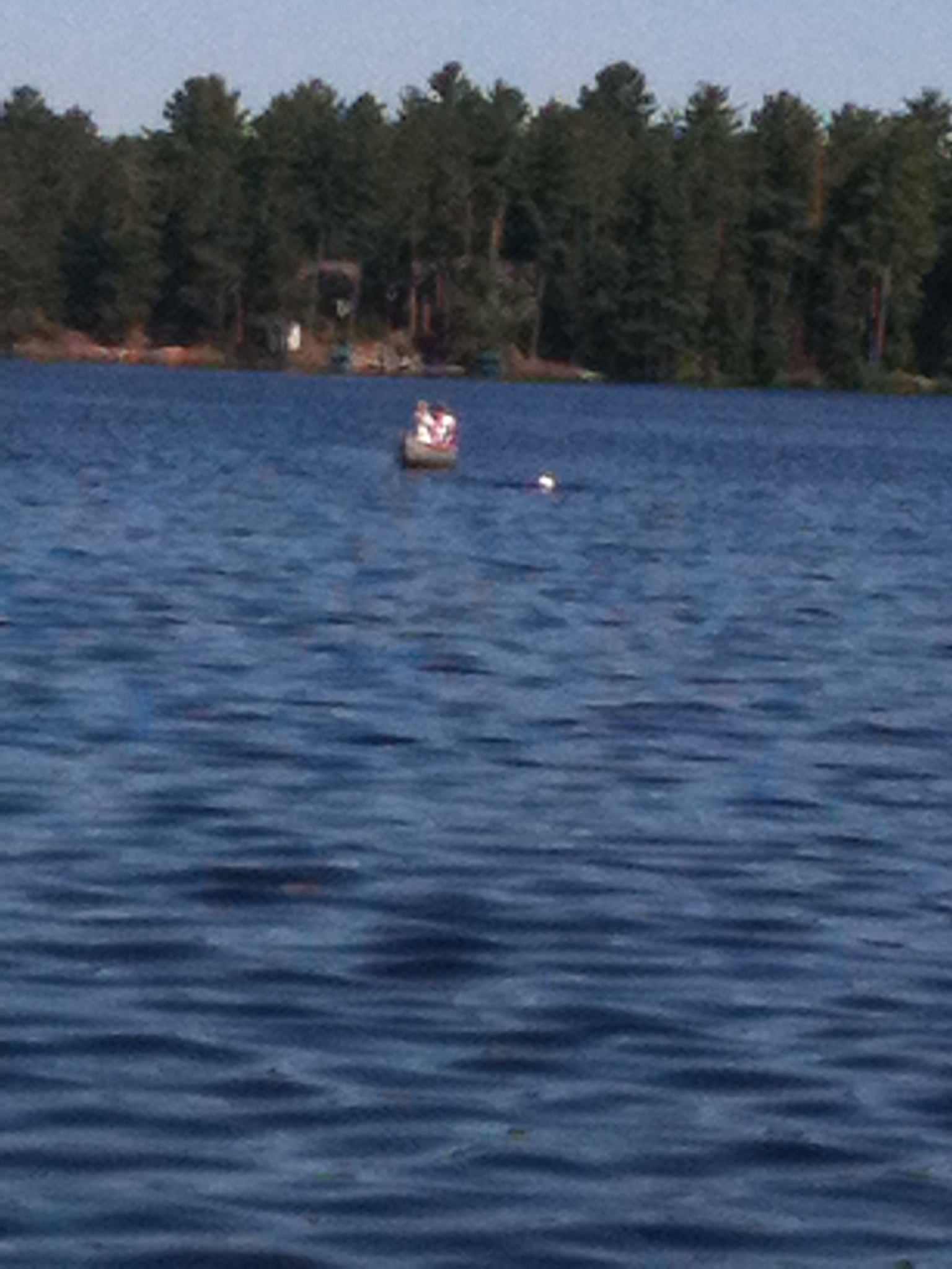 To my surprise, Victoria jumped at the chance to make what looked like a more than mile-long swim in chilly waters from Steve’s dock to the other side of the lake and back.